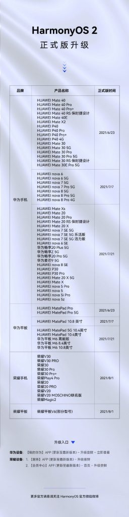 ล่าสุดบัญชีทางการของ HarmonyOS บน weibo เครือข่ายออนไลน์ที่ใหญ่ที่สุดในจีนได้เผยรายชื่อกลุ่มผลิตภัณฑ์ของ Huawei และ Honor ที่จะได้ทำการอัปเดตซอฟต์แวร์เป็น HarmonyOS ออกมาแล้วดังนี้