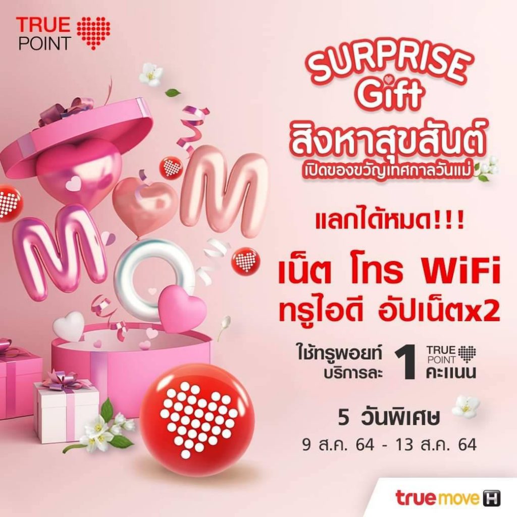 เริ่มที่ “ทรูมูฟ เอช” จัดแคมเปญ “สิงหาสุขสันต์ เปิดของขวัญเทศกาลวันแม่” ใช้ทรูพอยท์ 1 คะแนน เพื่อแลกบริการพิเศษ อาทิ เน็ต 1GB นาน 1 วัน มูลค่า 29 บาท โทรฟรีในเครือข่ายไม่อั้น 1 วัน มูลค่า 13 บาท WiFi ฟรี 1 วัน มูลค่า 39 บาท อัปเน็ตสูงสุด X2 กับ True Happiness Upgrade และดู TrueID ไม่อั้น นาน 24 ชม. มูลค่า 9 บาท ตั้งแต่วันที่ 9-13 สิงหาคมนี้