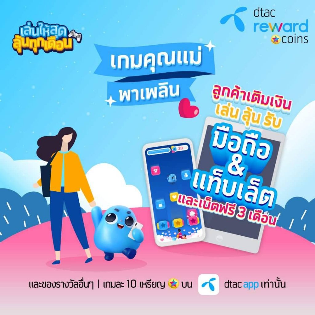 ต่อด้วย “ดีแทค” ชวนคุณแม่ที่ใช้บริการดีแทคเติมเงินมาเล่นเกมคุณแม่พาเพลินบนดีแทคแอป เพียงใช้ดีแทครีวอร์ดคอยน์เพียงเกมละ 10 เหรียญ เพื่อลุ้นรับของรางวัล มูลค่ารวม 600,000 บาท เช่น iPhone 12 Pro Max 128GB, iPhone 12 64GB, iPad Pro (2021) Wi-Fi 128GB และแพ็กเกจอินเตอร์เน็ต ไม่อั้นไม่ลดสปีด ความเร็ว 10Mbps นาน 90 วัน