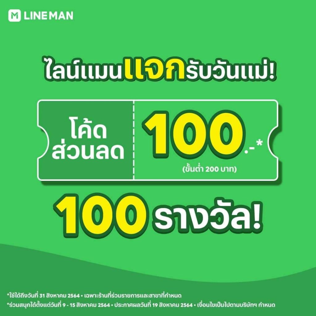 ส่วน “ไลน์แมน” ผุดแคมเปญ “ไลน์แมนแจกรับวันแม่” ชวนลูก ๆ มาร่วมสนุกผ่านทางเพจเฟซบุ๊ก “LINE MAN” แคปภาพร้านอาหารที่อยากสั่งให้แม่ทานในไลน์แมนพร้อมบอกเหตุผลและแชร์โพสต์ ตั้งแต่วันนี้-15 สิงหาคมนี้ ลุ้นรับโค้ดส่วนลด 100 บาท 100 รางวัล โดยจะประกาศผลวันที่ 19 สิงหาคม 2564