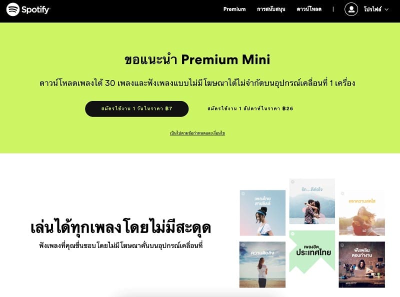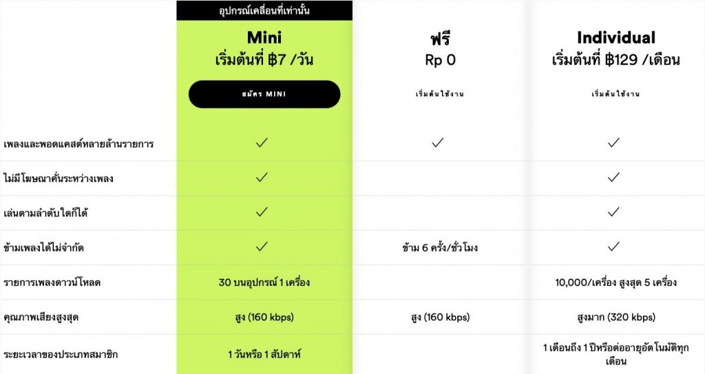 วิธีสมัครแพ็คเกจ Spotify Premium Mini 1.ดาวน์โหลดแอปพลิเคชัน สปอทิฟาย บนอุปกรณ์เคลื่อนที่ของคุณ หรือไปที่เว็บไซต์ สปอทิฟาย บนหน้าเดสก์ท็อป 2.เลือกเมนู “Premium“ ด้านขวาบนของเว็บไซต์ หรือด้านขวาล่างของแอปพลิเคชัน สปอทิฟาย 3.เลือก “สมัครใช้งาน Mini“ และเลือก “รายวัน“ หรือ “รายสัปดาห์“ โดยแพ็กเกจจะเป็นการชำระเงินล่วงหน้า 4.เลือกวิธีการชำระเงินที่มีมากมาย! ไม่จำเป็นต้องมีบัตรเครดิต คุณสามารถชำระเงินผ่านเครือข่ายโทรศัพท์ที่คุณใช้งานอยู่ 5.สมัครสมาชิก หรือเข้าสู่ระบบด้วยบัญชีผู้ใช้ สปอทิฟาย 6.ผู้ใช้สามารถเริ่มเพลิดเพลินไปกับประสบการณ์การฟังจาก สปอทิฟาย Premium Mini ในรูปแบบ รายวัน หรือรายสัปดาห์